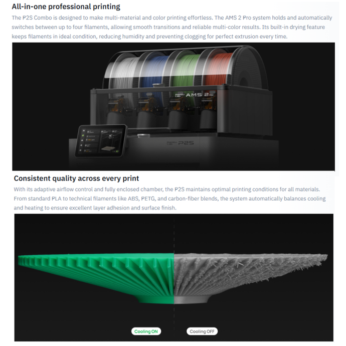 Bambu Lab P2S Combo combines the precision of the P2S 3D printer with the versatility of the AMS 2 Pro system. Together, they form a fully enclosed, intelligent printing setup that delivers professional results across multiple materials and colors. With automatic filament drying, smart material handling, and adaptive airflow control, this combo offers a complete solution for reliable, high-quality 3D printing.