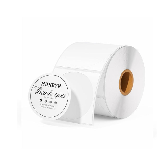 -Munbyn Generic Circle Series Labels (GR): Featuring 750 labels per roll (2" circle, 1 roll, white), these circle label stickers require no ink, toner, or ribbons. With a 0.98" paper tube diameter and a 3.38" paper roll diameter.